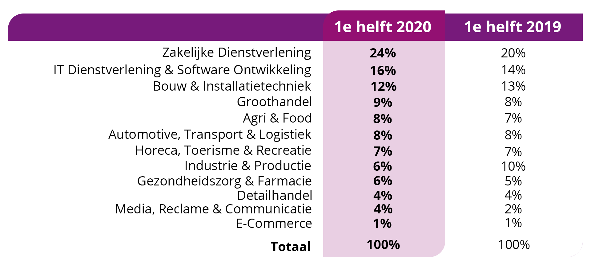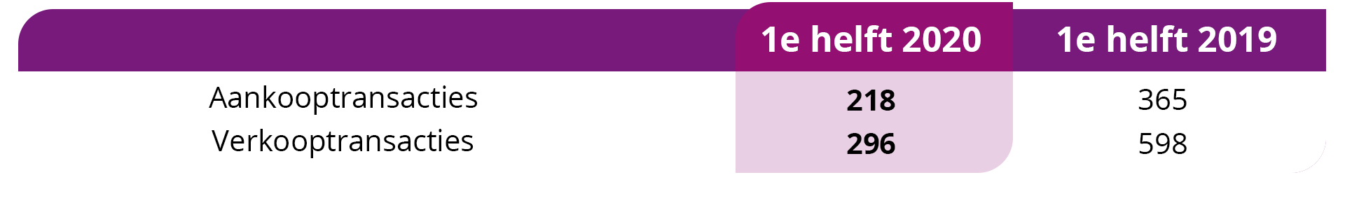 Ondanks het uiteenlopende effect van het coronavirus op de verschillende segmenten, zijn er (nog) geen grote verschuivingen te zien in het aandeel transacties per segment met uitzondering van Zakelijke Dienstverlening (+4%) en Industrie & Productie (-4%).